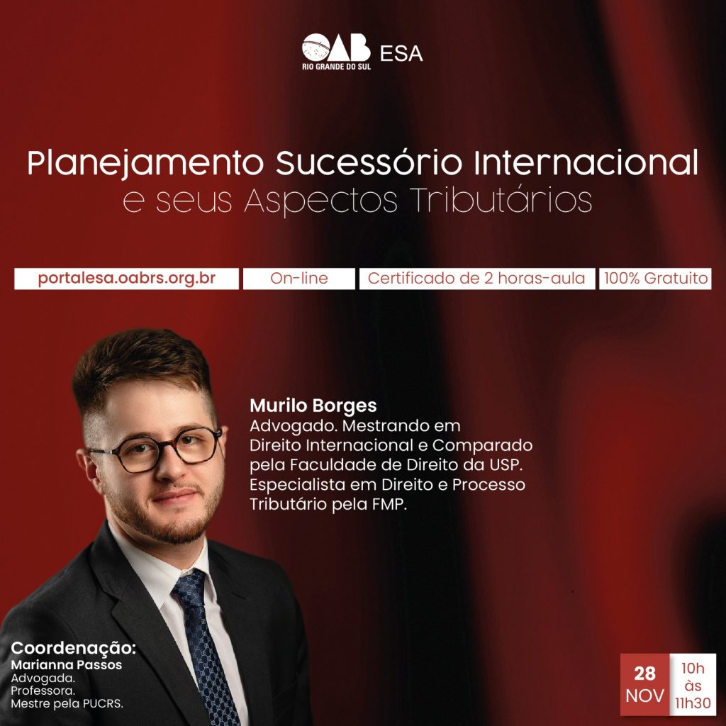No último dia 28 de novembro de 2024, nosso Sócio-Fundador, Murilo Borges, teve a honra de palestrar na Escola Superior da Advocacia (ESA) da Ordem dos Advogados do Brasil da seccional do Rio Grande do Sul (OAB/RS). O evento, que foi organizado pela ESA/RS, buscou demonstrar a experiência prática do Dr. Murilo Borges nos assuntos relacionados ao Planejamento Sucessório e suas implicações no Direito Tributário Internacional.
